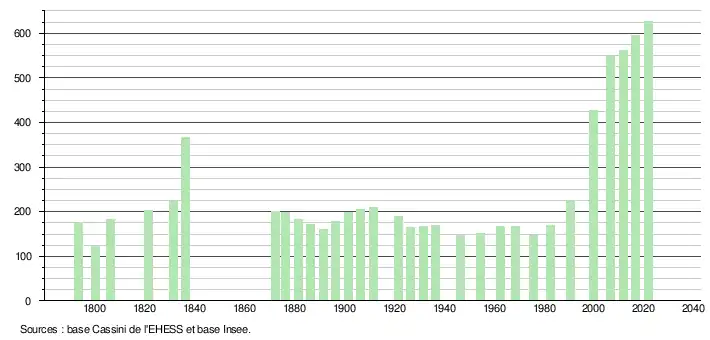 L'évolution du nombre d'habitants est connue à travers les recensements de la population effectués dans la commune depuis 1793. Pour les communes de moins de 10 000 habitants, une enquête de recensement portant sur toute la population est réalisée tous les cinq ans, les populations légales des années intermédiaires étant quant à elles estimées par interpolation ou extrapolation[25]. Pour la commune, le premier recensement exhaustif entrant dans le cadre du nouveau dispositif a été réalisé en 2006[26].