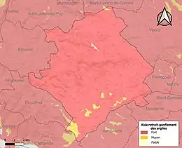 La commune est vulnérable au risque de mouvements de terrains constitué principalement du retrait-gonflement des sols argileux[29]. Cet aléa est susceptible d'engendrer des dommages importants aux bâtiments en cas d’alternance de périodes de sécheresse et de pluie. 99,9 % de la superficie communale est en aléa moyen ou fort (76,3 % au niveau départemental et 48,5 % au niveau national). Sur les 811 bâtiments dénombrés sur la commune en 2019, 811 sont en aléa moyen ou fort, soit 100 %, à comparer aux 90 % au niveau départemental et 54 % au niveau national. Une cartographie de l'exposition du territoire national au retrait gonflement des sols argileux est disponible sur le site du BRGM[30],[Carte 3].