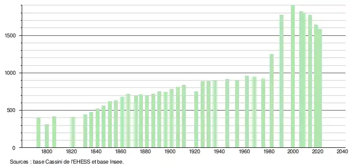 L'évolution du nombre d'habitants est connue à travers les recensements de la population effectués dans la commune depuis 1793. Pour les communes de moins de 10 000 habitants, une enquête de recensement portant sur toute la population est réalisée tous les cinq ans, les populations légales des années intermédiaires étant quant à elles estimées par interpolation ou extrapolation[32]. Pour la commune, le premier recensement exhaustif entrant dans le cadre du nouveau dispositif a été réalisé en 2008[33].