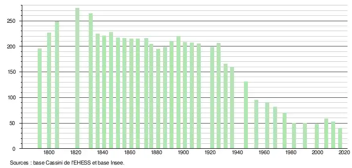 L'évolution du nombre d'habitants est connue à travers les recensements de la population effectués dans la commune depuis 1793. Pour les communes de moins de 10 000 habitants, une enquête de recensement portant sur toute la population est réalisée tous les cinq ans, les populations légales des années intermédiaires étant quant à elles estimées par interpolation ou extrapolation[5]. Pour la commune, le premier recensement exhaustif entrant dans le cadre du nouveau dispositif a été réalisé en 2006[6].