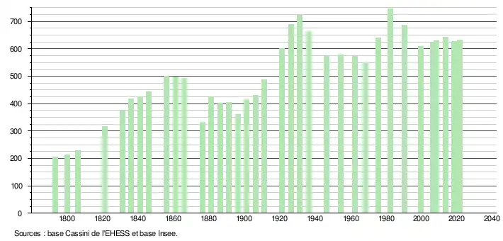 L'évolution du nombre d'habitants est connue à travers les recensements de la population effectués dans la commune depuis 1793. Pour les communes de moins de 10 000 habitants, une enquête de recensement portant sur toute la population est réalisée tous les cinq ans, les populations légales des années intermédiaires étant quant à elles estimées par interpolation ou extrapolation[20]. Pour la commune, le premier recensement exhaustif entrant dans le cadre du nouveau dispositif a été réalisé en 2008[21].