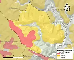 Les mouvements de terrains susceptibles de se produire sur la commune sont des tassements différentiels[36]. Le retrait-gonflement des sols argileux est susceptible d'engendrer des dommages importants aux bâtiments en cas d’alternance de périodes de sécheresse et de pluie[37]. 74,4 % de la superficie communale est en aléa moyen ou fort (58,6 % au niveau départemental et 48,5 % au niveau national métropolitain)[Carte 3]. Depuis le , en application de la loi ÉLAN, différentes contraintes s'imposent aux vendeurs, maîtres d'ouvrages ou constructeurs de biens situés dans une zone classée en aléa moyen ou fort[Note 4],[38].