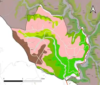 L'occupation des sols de la commune, telle qu'elle ressort de la base de données européenne d’occupation biophysique des sols Corine Land Cover (CLC), est marquée par l'importance des forêts et milieux semi-naturels (67,5 % en 2018), en augmentation par rapport à 1990 (66 %). La répartition détaillée en 2018 est la suivante : forêts (67,5 %), zones agricoles hétérogènes (19,3 %), prairies (13,2 %)[30]. L'évolution de l’occupation des sols de la commune et de ses infrastructures peut être observée sur les différentes représentations cartographiques du territoire : la carte de Cassini (XVIIIe siècle), la carte d'état-major (1820-1866) et les cartes ou photos aériennes de l'IGN pour la période actuelle (1950 à aujourd'hui)[Carte 2].