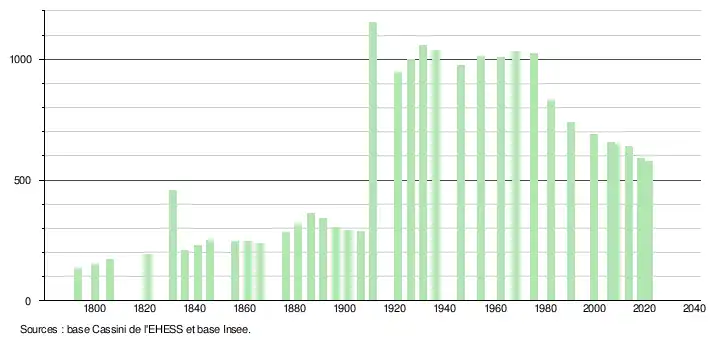 L'évolution du nombre d'habitants est connue à travers les recensements de la population effectués dans la commune depuis 1793. Pour les communes de moins de 10 000 habitants, une enquête de recensement portant sur toute la population est réalisée tous les cinq ans, les populations légales des années intermédiaires étant quant à elles estimées par interpolation ou extrapolation[19]. Pour la commune, le premier recensement exhaustif entrant dans le cadre du nouveau dispositif a été réalisé en 2008[20].