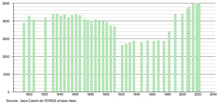 L'évolution du nombre d'habitants est connue à travers les recensements de la population effectués dans la commune depuis 1793. Pour les communes de moins de 10 000 habitants, une enquête de recensement portant sur toute la population est réalisée tous les cinq ans, les populations légales des années intermédiaires étant quant à elles estimées par interpolation ou extrapolation[40]. Pour la commune, le premier recensement exhaustif entrant dans le cadre du nouveau dispositif a été réalisé en 2008[41].