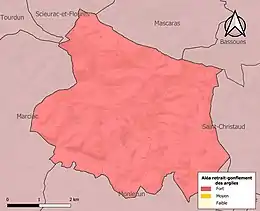 Le retrait-gonflement des sols argileux est susceptible d'engendrer des dommages importants aux bâtiments en cas d’alternance de périodes de sécheresse et de pluie. La totalité de la commune est en aléa moyen ou fort (94,5 % au niveau départemental et 48,5 % au niveau national). Sur les 69 bâtiments dénombrés sur la commune en 2019, 69 sont en aléa moyen ou fort, soit 100 %, à comparer aux 93 % au niveau départemental et 54 % au niveau national. Une cartographie de l'exposition du territoire national au retrait gonflement des sols argileux est disponible sur le site du BRGM[19],[Carte 3].