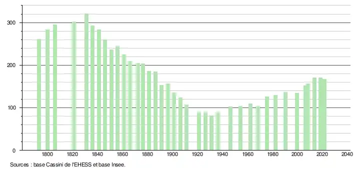 L'évolution du nombre d'habitants est connue à travers les recensements de la population effectués dans la commune depuis 1793. Pour les communes de moins de 10 000 habitants, une enquête de recensement portant sur toute la population est réalisée tous les cinq ans, les populations légales des années intermédiaires étant quant à elles estimées par interpolation ou extrapolation[21]. Pour la commune, le premier recensement exhaustif entrant dans le cadre du nouveau dispositif a été réalisé en 2008[22].