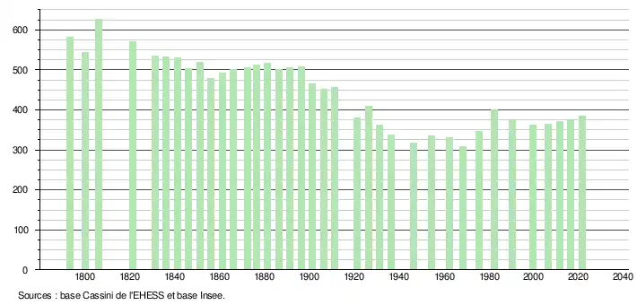 L'évolution du nombre d'habitants est connue à travers les recensements de la population effectués dans la commune depuis 1793. Pour les communes de moins de 10 000 habitants, une enquête de recensement portant sur toute la population est réalisée tous les cinq ans, les populations légales des années intermédiaires étant quant à elles estimées par interpolation ou extrapolation[16]. Pour la commune, le premier recensement exhaustif entrant dans le cadre du nouveau dispositif a été réalisé en 2006[17].