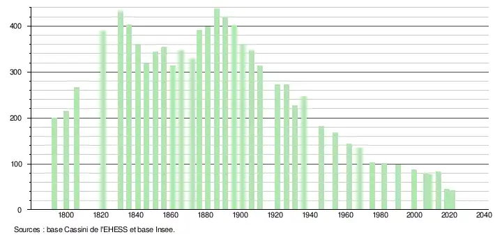 L'évolution du nombre d'habitants est connue à travers les recensements de la population effectués dans la commune depuis 1793. Pour les communes de moins de 10 000 habitants, une enquête de recensement portant sur toute la population est réalisée tous les cinq ans, les populations légales des années intermédiaires étant quant à elles estimées par interpolation ou extrapolation[17]. Pour la commune, le premier recensement exhaustif entrant dans le cadre du nouveau dispositif a été réalisé en 2008[18].