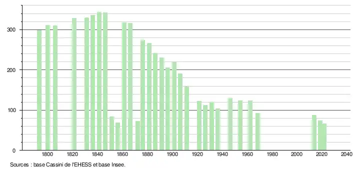 L'évolution du nombre d'habitants est connue à travers les recensements de la population effectués dans la commune depuis 1793. Pour les communes de moins de 10 000 habitants, une enquête de recensement portant sur toute la population est réalisée tous les cinq ans, les populations légales des années intermédiaires étant quant à elles estimées par interpolation ou extrapolation[9]. Pour la commune, le premier recensement exhaustif entrant dans le cadre du nouveau dispositif a été réalisé en 2008[10].