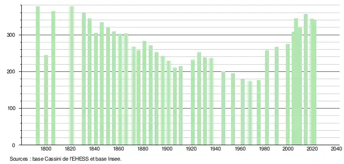 L'évolution du nombre d'habitants est connue à travers les recensements de la population effectués dans la commune depuis 1793. Pour les communes de moins de 10 000 habitants, une enquête de recensement portant sur toute la population est réalisée tous les cinq ans, les populations légales des années intermédiaires étant quant à elles estimées par interpolation ou extrapolation[29]. Pour la commune, le premier recensement exhaustif entrant dans le cadre du nouveau dispositif a été réalisé en 2004[30].