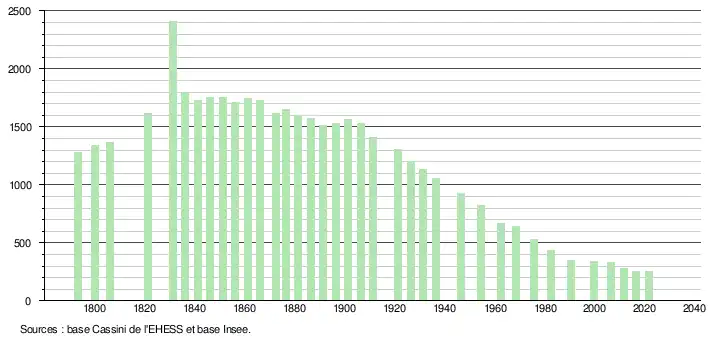 L'évolution du nombre d'habitants est connue à travers les recensements de la population effectués dans la commune depuis 1793. Pour les communes de moins de 10 000 habitants, une enquête de recensement portant sur toute la population est réalisée tous les cinq ans, les populations légales des années intermédiaires étant quant à elles estimées par interpolation ou extrapolation[18]. Pour la commune, le premier recensement exhaustif entrant dans le cadre du nouveau dispositif a été réalisé en 2006[19].