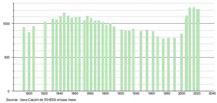 L'évolution du nombre d'habitants est connue à travers les recensements de la population effectués dans la commune depuis 1793. Pour les communes de moins de 10 000 habitants, une enquête de recensement portant sur toute la population est réalisée tous les cinq ans, les populations légales des années intermédiaires étant quant à elles estimées par interpolation ou extrapolation[21]. Pour la commune, le premier recensement exhaustif entrant dans le cadre du nouveau dispositif a été réalisé en 2005[22].
