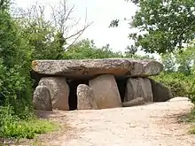 - Dolmen de la Frébouchère[24] : de type angevin composé d'une grande salle (on pourrait y loger une voiture[réf. nécessaire]) à laquelle on accède par un portique composé de trois pierres. Aujourd'hui ne subsistent en place que les deux piliers. Le linteau a été déposé. Sa dalle de couverture était initialement un bloc de granite estimé à 80 tonnes. À la fin du XIXe siècle, un violent orage déstabilise le monument et fracture la dalle ; le monument est restauré à l'époque par l'abbé Baudry.