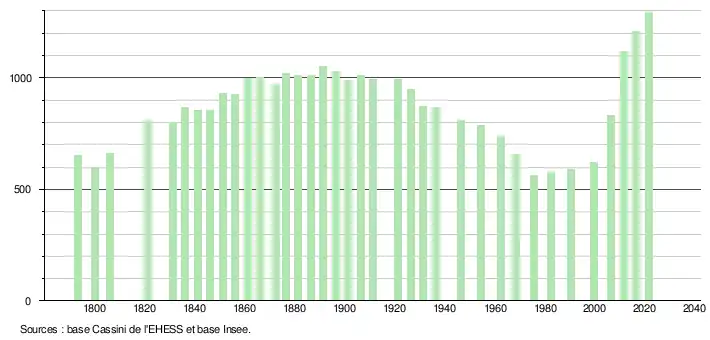 L'évolution du nombre d'habitants est connue à travers les recensements de la population effectués dans la commune depuis 1793. Pour les communes de moins de 10 000 habitants, une enquête de recensement portant sur toute la population est réalisée tous les cinq ans, les populations légales des années intermédiaires étant quant à elles estimées par interpolation ou extrapolation[19]. Pour la commune, le premier recensement exhaustif entrant dans le cadre du nouveau dispositif a été réalisé en 2006[20].