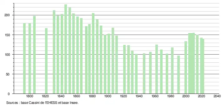 L'évolution du nombre d'habitants est connue à travers les recensements de la population effectués dans la commune depuis 1793. Pour les communes de moins de 10 000 habitants, une enquête de recensement portant sur toute la population est réalisée tous les cinq ans, les populations légales des années intermédiaires étant quant à elles estimées par interpolation ou extrapolation[17]. Pour la commune, le premier recensement exhaustif entrant dans le cadre du nouveau dispositif a été réalisé en 2004[18].