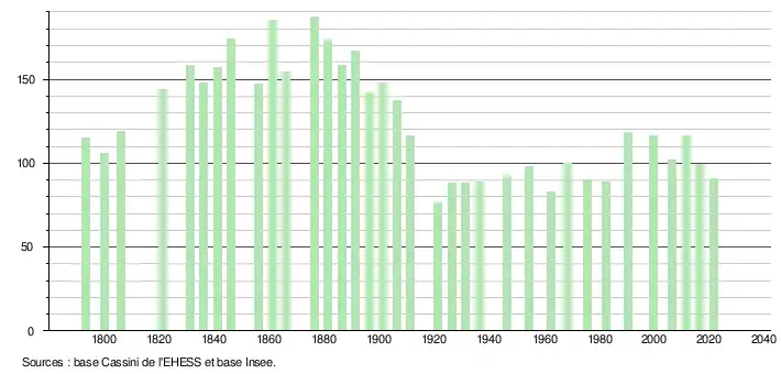 L'évolution du nombre d'habitants est connue à travers les recensements de la population effectués dans la commune depuis 1793. Pour les communes de moins de 10 000 habitants, une enquête de recensement portant sur toute la population est réalisée tous les cinq ans, les populations légales des années intermédiaires étant quant à elles estimées par interpolation ou extrapolation[29]. Pour la commune, le premier recensement exhaustif entrant dans le cadre du nouveau dispositif a été réalisé en 2006[30].