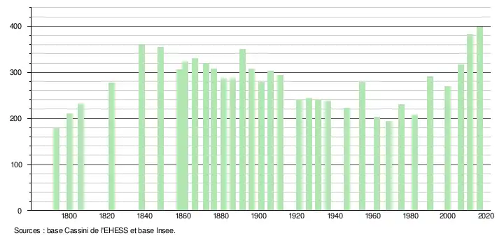 L'évolution du nombre d'habitants est connue à travers les recensements de la population effectués dans la commune depuis 1793. Pour les communes de moins de 10 000 habitants, une enquête de recensement portant sur toute la population est réalisée tous les cinq ans, les populations légales des années intermédiaires étant quant à elles estimées par interpolation ou extrapolation[4]. Pour la commune, le premier recensement exhaustif entrant dans le cadre du nouveau dispositif a été réalisé en 2006[5].