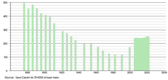 L'évolution du nombre d'habitants est connue à travers les recensements de la population effectués dans la commune depuis 1876. Pour les communes de moins de 10 000 habitants, une enquête de recensement portant sur toute la population est réalisée tous les cinq ans, les populations légales des années intermédiaires étant quant à elles estimées par interpolation ou extrapolation[15]. Pour la commune, le premier recensement exhaustif entrant dans le cadre du nouveau dispositif a été réalisé en 2005[16].