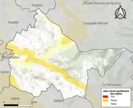 Le retrait-gonflement des sols argileux est susceptible d'engendrer des dommages importants aux bâtiments en cas d’alternance de périodes de sécheresse et de pluie. 13,4 % de la superficie communale est en aléa moyen ou fort (67,7 % au niveau départemental et 48,5 % au niveau national). Sur les 177 bâtiments dénombrés sur la commune en 2019, 38 sont en aléa moyen ou fort, soit 21 %, à comparer aux 72 % au niveau départemental et 54 % au niveau national. Une cartographie de l'exposition du territoire national au retrait gonflement des sols argileux est disponible sur le site du BRGM[28],[Carte 2].