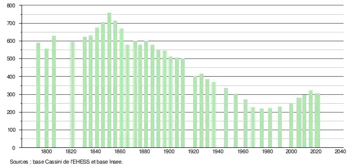 L'évolution du nombre d'habitants est connue à travers les recensements de la population effectués dans la commune depuis 1793. Pour les communes de moins de 10 000 habitants, une enquête de recensement portant sur toute la population est réalisée tous les cinq ans, les populations légales des années intermédiaires étant quant à elles estimées par interpolation ou extrapolation[35]. Pour la commune, le premier recensement exhaustif entrant dans le cadre du nouveau dispositif a été réalisé en 2005[36].