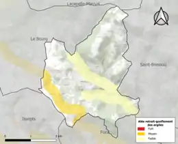 Le retrait-gonflement des sols argileux est susceptible d'engendrer des dommages importants aux bâtiments en cas d’alternance de périodes de sécheresse et de pluie. 8,8 % de la superficie communale est en aléa moyen ou fort (67,7 % au niveau départemental et 48,5 % au niveau national). Sur les 104 bâtiments dénombrés sur la commune en 2019, 11 sont en aléa moyen ou fort, soit 11 %, à comparer aux 72 % au niveau départemental et 54 % au niveau national. Une cartographie de l'exposition du territoire national au retrait gonflement des sols argileux est disponible sur le site du BRGM[24],[Carte 2].