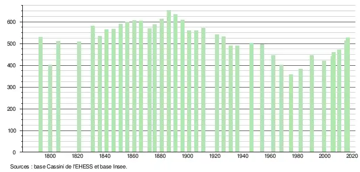 C'est en 1886 que la population connaissait son maximum avec 652 habitants. Elle était essentiellement constituée de personnes travaillant dans une multitude de petites borderies.