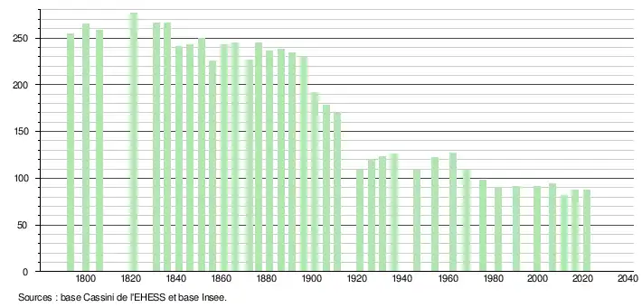 L'évolution du nombre d'habitants est connue à travers les recensements de la population effectués dans la commune depuis 1793. Pour les communes de moins de 10 000 habitants, une enquête de recensement portant sur toute la population est réalisée tous les cinq ans, les populations légales des années intermédiaires étant quant à elles estimées par interpolation ou extrapolation[21]. Pour la commune, le premier recensement exhaustif entrant dans le cadre du nouveau dispositif a été réalisé en 2006[22].