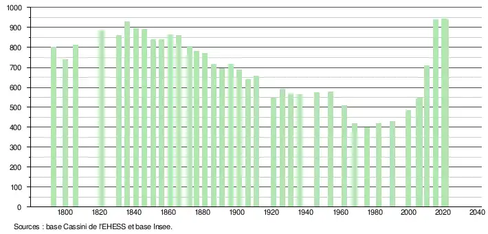 L'évolution du nombre d'habitants est connue à travers les recensements de la population effectués dans la commune depuis 1793. Pour les communes de moins de 10 000 habitants, une enquête de recensement portant sur toute la population est réalisée tous les cinq ans, les populations légales des années intermédiaires étant quant à elles estimées par interpolation ou extrapolation[35]. Pour la commune, le premier recensement exhaustif entrant dans le cadre du nouveau dispositif a été réalisé en 2005[36].