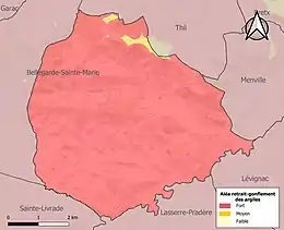 Le retrait-gonflement des sols argileux est susceptible d'engendrer des dommages importants aux bâtiments en cas d’alternance de périodes de sécheresse et de pluie. La totalité de la commune est en aléa moyen ou fort (88,8 % au niveau départemental et 48,5 % au niveau national). Sur les 328 bâtiments dénombrés sur la commune en 2019, 328 sont en aléa moyen ou fort, soit 100 %, à comparer aux 98 % au niveau départemental et 54 % au niveau national. Une cartographie de l'exposition du territoire national au retrait gonflement des sols argileux est disponible sur le site du BRGM[23],[Carte 1].