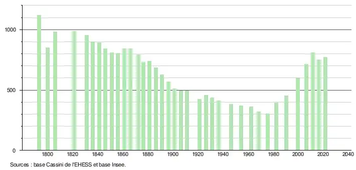 L'évolution du nombre d'habitants est connue à travers les recensements de la population effectués dans la commune depuis 1793. Pour les communes de moins de 10 000 habitants, une enquête de recensement portant sur toute la population est réalisée tous les cinq ans, les populations légales des années intermédiaires étant quant à elles estimées par interpolation ou extrapolation[32]. Pour la commune, le premier recensement exhaustif entrant dans le cadre du nouveau dispositif a été réalisé en 2006[33].
