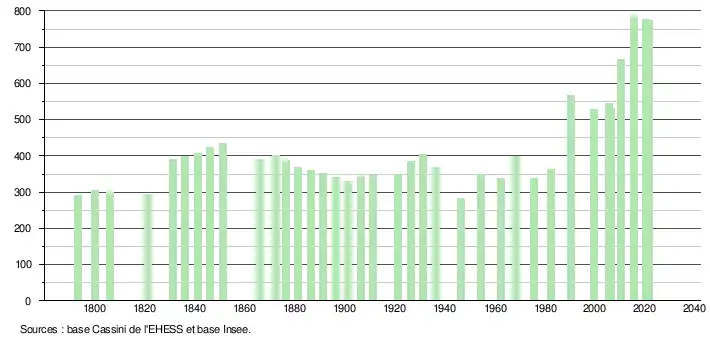 L'évolution du nombre d'habitants est connue à travers les recensements de la population effectués dans la commune depuis 1793. Pour les communes de moins de 10 000 habitants, une enquête de recensement portant sur toute la population est réalisée tous les cinq ans, les populations légales des années intermédiaires étant quant à elles estimées par interpolation ou extrapolation[19]. Pour la commune, le premier recensement exhaustif entrant dans le cadre du nouveau dispositif a été réalisé en 2005[20].