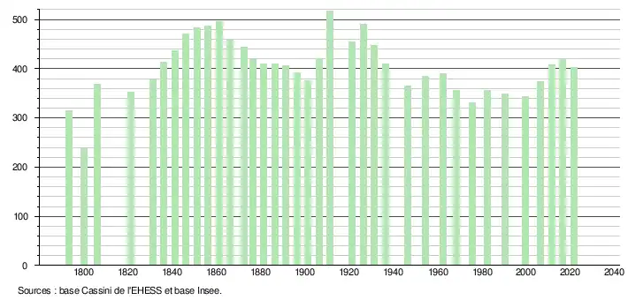 L'évolution du nombre d'habitants est connue à travers les recensements de la population effectués dans la commune depuis 1793. Pour les communes de moins de 10 000 habitants, une enquête de recensement portant sur toute la population est réalisée tous les cinq ans, les populations légales des années intermédiaires étant quant à elles estimées par interpolation ou extrapolation[25]. Pour la commune, le premier recensement exhaustif entrant dans le cadre du nouveau dispositif a été réalisé en 2006[26].