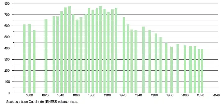 On peut relever des chiffres nettement supérieurs durant les siècles précédents : 612 en 1790 et un maximum de 777 en 1891.