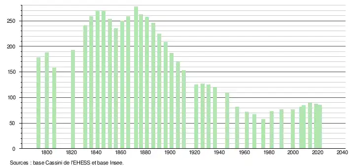 L'évolution du nombre d'habitants est connue à travers les recensements de la population effectués dans la commune depuis 1793. Pour les communes de moins de 10 000 habitants, une enquête de recensement portant sur toute la population est réalisée tous les cinq ans, les populations légales des années intermédiaires étant quant à elles estimées par interpolation ou extrapolation[18]. Pour la commune, le premier recensement exhaustif entrant dans le cadre du nouveau dispositif a été réalisé en 2008[19].