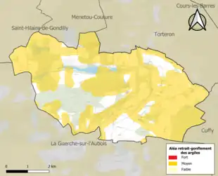 La commune est vulnérable au risque de mouvements de terrains constitué principalement du retrait-gonflement des sols argileux[15]. Cet aléa est susceptible d'engendrer des dommages importants aux bâtiments en cas d’alternance de périodes de sécheresse et de pluie. 73,3 % de la superficie communale est en aléa moyen ou fort (90 % au niveau départemental et 48,5 % au niveau national). Sur les 143 bâtiments dénombrés sur la commune en 2019, 110 sont en aléa moyen ou fort, soit 77 %, à comparer aux 83 % au niveau départemental et 54 % au niveau national. Une cartographie de l'exposition du territoire national au retrait gonflement des sols argileux est disponible sur le site du BRGM[16],[Carte 2].