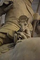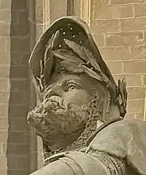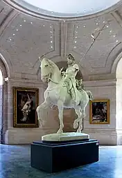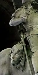 Il s’agit d’un groupe en plâtre : le chevalier est assis sur sa selle, ses solerets à poulaine parés d’éperons, bien enfoncé dans ses étriers. Il a le regard levé, le torse bombé, revêtu d’une armure de style médiévale, il tient les rênes de sa main gauche et une main de justice dans la droite. Son heaume ouvert laisse voir son visage barbu, sur sa tête est posée une couronne de laurier. Il est armé d’une épée à sa ceinture et d’une lance avec son oriflamme dans le dos.