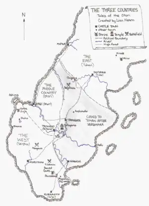 L'action pourrait se localiser géographiquement à l'extrémité ouest de Honshū, sur un territoire correspondant à la région de Chūgoku. D’après l’auteur[2], seules les villes de Hagi et Matsue décrites dans le roman correspondent aux villes réelles. À noter : les points cardinaux dans le roman sont tournés de 45° dans le sens inverse des aiguilles d'une montre, le nord des Trois Pays (cf. carte ci-contre) correspondant au nord-est dans le cadre réel.