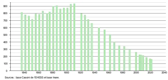 L'évolution du nombre d'habitants est connue à travers les recensements de la population effectués dans la commune depuis 1836. Pour les communes de moins de 10 000 habitants, une enquête de recensement portant sur toute la population est réalisée tous les cinq ans, les populations légales des années intermédiaires étant quant à elles estimées par interpolation ou extrapolation[14]. Pour la commune, le premier recensement exhaustif entrant dans le cadre du nouveau dispositif a été réalisé en 2004[15].