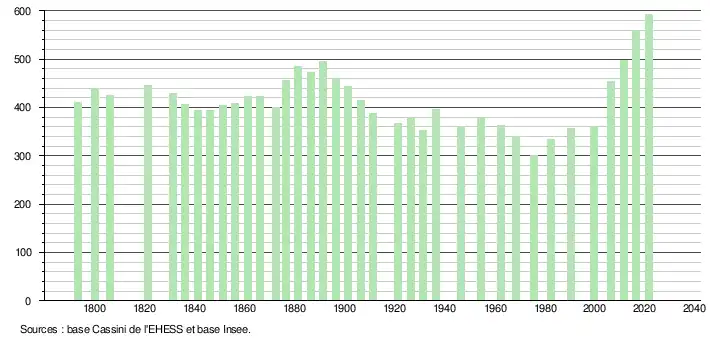 L'évolution du nombre d'habitants est connue à travers les recensements de la population effectués dans la commune depuis 1793. Pour les communes de moins de 10 000 habitants, une enquête de recensement portant sur toute la population est réalisée tous les cinq ans, les populations légales des années intermédiaires étant quant à elles estimées par interpolation ou extrapolation[17]. Pour la commune, le premier recensement exhaustif entrant dans le cadre du nouveau dispositif a été réalisé en 2006[18].
