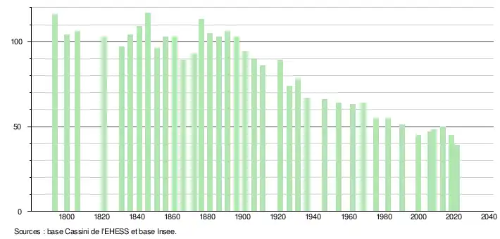 L'évolution du nombre d'habitants est connue à travers les recensements de la population effectués dans la commune depuis 1793. Pour les communes de moins de 10 000 habitants, une enquête de recensement portant sur toute la population est réalisée tous les cinq ans, les populations légales des années intermédiaires étant quant à elles estimées par interpolation ou extrapolation[13]. Pour la commune, le premier recensement exhaustif entrant dans le cadre du nouveau dispositif a été réalisé en 2008[14].