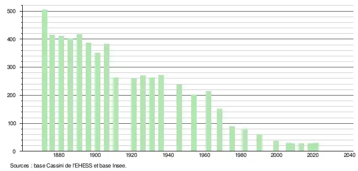 L'évolution du nombre d'habitants est connue à travers les recensements de la population effectués dans la commune depuis 1872. Pour les communes de moins de 10 000 habitants, une enquête de recensement portant sur toute la population est réalisée tous les cinq ans, les populations légales des années intermédiaires étant quant à elles estimées par interpolation ou extrapolation[13]. Pour la commune, le premier recensement exhaustif entrant dans le cadre du nouveau dispositif a été réalisé en 2008[14].