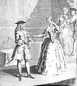 Lady Plyant ― Je jure, monsieur Careless, que vous êtes très attirant, et que vous dites des choses très délicates, et rien n’est plus touchant pour moi qu’une chose délicate. Et puis je dois vous rendre cette justice que personne jusque là ne m’a captivée autant que vous-même. Je reconnais en rougissant que vous avez ébranlé, si je puis dire, les fondements les plus profonds de mon honneur. Il est certain que si j’échappe à vos sollicitations, je m’en honorerai toute ma vie, je le jure. |