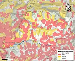 La commune est vulnérable au risque de mouvements de terrains constitué principalement du retrait-gonflement des sols argileux[23]. Cet aléa est susceptible d'engendrer des dommages importants aux bâtiments en cas d’alternance de périodes de sécheresse et de pluie. 65,6 % de la superficie communale est en aléa moyen ou fort (76,3 % au niveau départemental et 48,5 % au niveau national). Sur les 253 bâtiments dénombrés sur la commune en 2019, 181 sont en aléa moyen ou fort, soit 72 %, à comparer aux 90 % au niveau départemental et 54 % au niveau national. Une cartographie de l'exposition du territoire national au retrait gonflement des sols argileux est disponible sur le site du BRGM[24],[Carte 3].