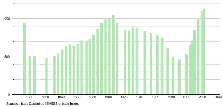 L'évolution du nombre d'habitants est connue à travers les recensements de la population effectués dans la commune depuis 1793. Pour les communes de moins de 10 000 habitants, une enquête de recensement portant sur toute la population est réalisée tous les cinq ans, les populations légales des années intermédiaires étant quant à elles estimées par interpolation ou extrapolation[21]. Pour la commune, le premier recensement exhaustif entrant dans le cadre du nouveau dispositif a été réalisé en 2004[22].