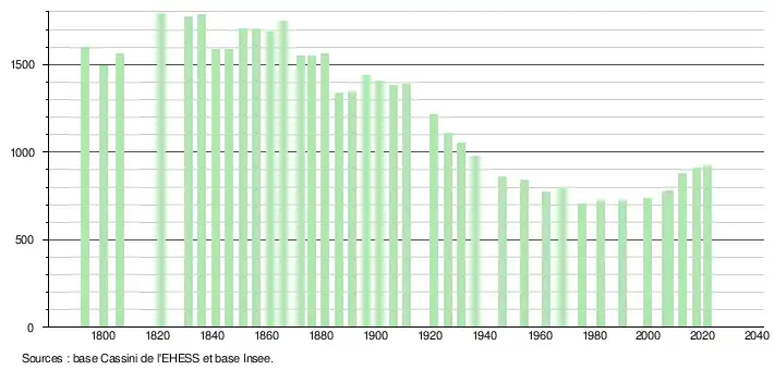 L'évolution du nombre d'habitants est connue à travers les recensements de la population effectués dans la commune depuis 1793. Pour les communes de moins de 10 000 habitants, une enquête de recensement portant sur toute la population est réalisée tous les cinq ans, les populations légales des années intermédiaires étant quant à elles estimées par interpolation ou extrapolation[16]. Pour la commune, le premier recensement exhaustif entrant dans le cadre du nouveau dispositif a été réalisé en 2007[17].