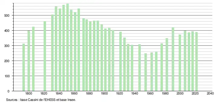 L'évolution du nombre d'habitants est connue à travers les recensements de la population effectués dans la commune depuis 1793. Pour les communes de moins de 10 000 habitants, une enquête de recensement portant sur toute la population est réalisée tous les cinq ans, les populations légales des années intermédiaires étant quant à elles estimées par interpolation ou extrapolation[20]. Pour la commune, le premier recensement exhaustif entrant dans le cadre du nouveau dispositif a été réalisé en 2006[21].