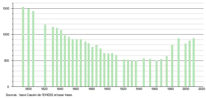 L'évolution du nombre d'habitants est connue à travers les recensements de la population effectués dans la commune depuis 1793. À partir du , les populations légales des communes sont publiées annuellement dans le cadre d'un recensement qui repose désormais sur une collecte d'information annuelle, concernant successivement tous les territoires communaux au cours d'une période de cinq ans. Pour les communes de moins de 10 000 habitants, une enquête de recensement portant sur toute la population est réalisée tous les cinq ans, les populations légales des années intermédiaires étant quant à elles estimées par interpolation ou extrapolation[5]. Pour la commune, le premier recensement exhaustif entrant dans le cadre du nouveau dispositif a été réalisé en 2004[6],[Note 1].