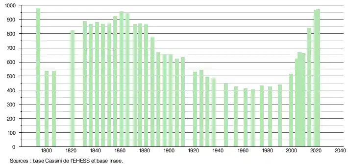 L'évolution du nombre d'habitants est connue à travers les recensements de la population effectués dans la commune depuis 1793. Pour les communes de moins de 10 000 habitants, une enquête de recensement portant sur toute la population est réalisée tous les cinq ans, les populations légales des années intermédiaires étant quant à elles estimées par interpolation ou extrapolation[15]. Pour la commune, le premier recensement exhaustif entrant dans le cadre du nouveau dispositif a été réalisé en 2004[16].