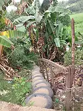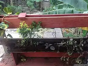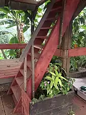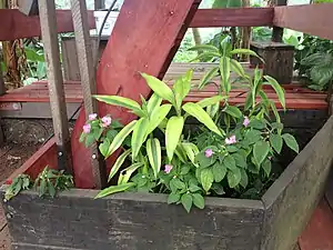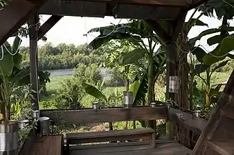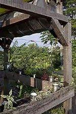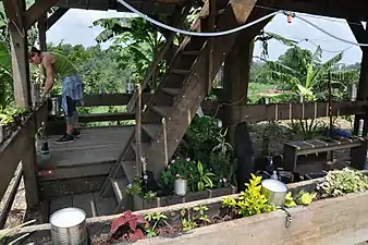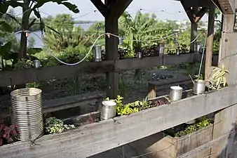 Le jardin botanique, situé dans le périmètre de la structure en bois, accueille des fleurs, des plantes cosmétiques, des épices et des plantes thérapeutiques. Le Jardin sonore est équipé d'un système d'irrigation durable par « goutte à goutte », qui permet d'atteindre une autonomie en eau allant jusqu'à six mois. L'eau de pluie est collectée, stockée dans des barils puis distribuée via des tubes transparents au jardin vertical en utilisant un système de goutte à goutte hydroponique. Ce système permet de ne pas perdre d'eau et, en même temps, ne nécessite pas un arrosage régulier de la part des habitants. Les gouttes d'eau tombent dans des boîtes de tailles différentes, créant des notes et nourrissant les plantes pour les habitants de Bonamouti. Différents sons sortent du jardin, ils sont directement liés aux besoins en eau des plantes. Ce jardin suspendu pousse au son de l'eau et invite le public à contempler le fleuve Wouri de chacun de ses trois niveaux.